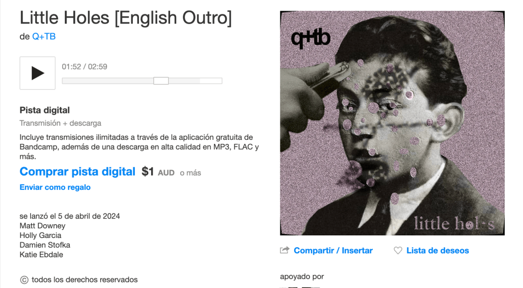 El proyecto australiano Q+TB presentan el sencillo «Little Holes», una canción que navega por géneros como Electro Pop, Indie Pop y Dream Pop la cual construye y desarrolla una identidad ética, energética, dinámica y altamente expresiva en el que la crudeza de las guitarras alimentadas de forma natural, la fuerza expresiva de la voz, quien a su vez hace brillar el dinamismo de identidad pegadiza de la letra, esta canción presenta un sonido cohesivo perfecto para fluir de manera natural y orgánica a los oídos y corazones de los escuchas, esto sin perder fuerza y contundencia, la energía de esta canción hará que termines coreándola por un largo tiempo, «Little Holes» es una explosión de fuerza, dinamismo y crudeza.